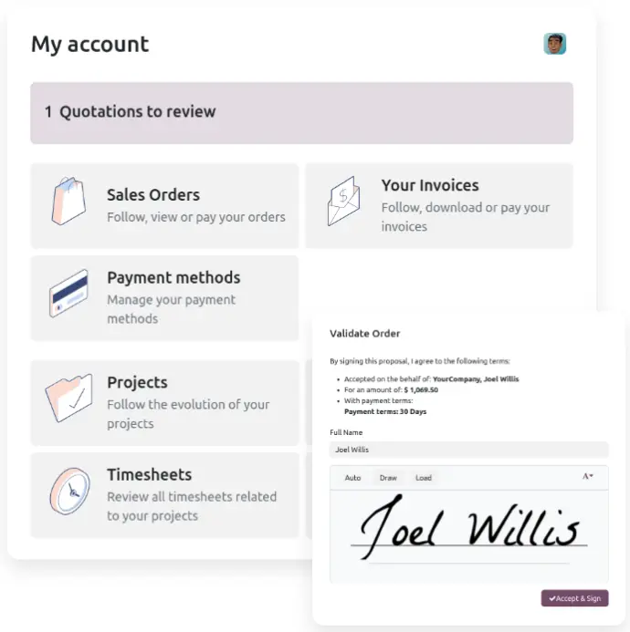 Otimize seu tempo com pagamentos online e acelere o fechamento de negócios através de assinaturas eletrônicas em cotações, contratos e outros documentos.